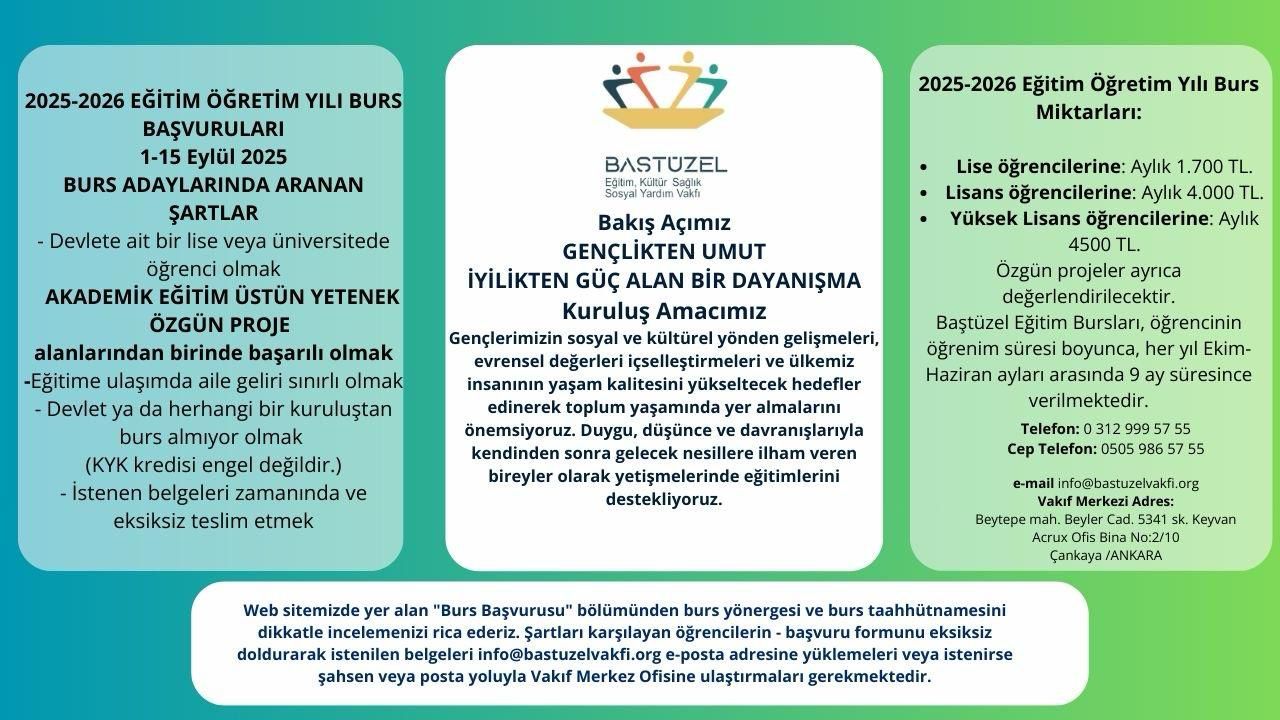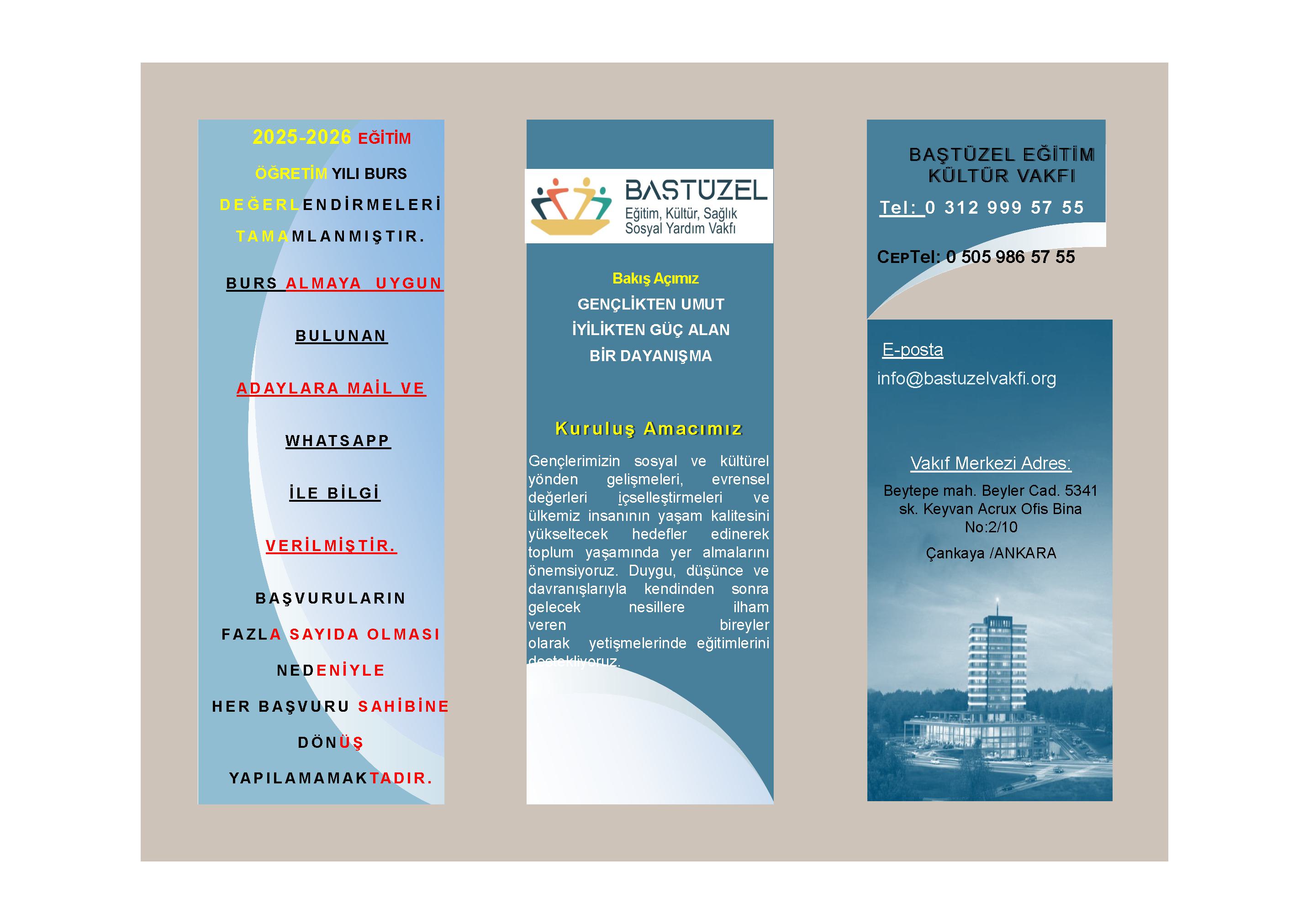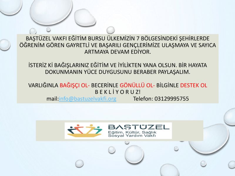 Baştüzel Eğitim ve Kültür Vakfı Olarak Ögrencilerimize Eğitim ve Kültür Alanında Bir Çok İmkan Saglamaktayız.Sizlerde Vakfımıza ve Ögrenci Kardeşlerimize Destek Olabilmek Adına Bağışçı Olabilir , Gönüllü Olabilir veya İhtiyaç Listesi Karşılayabilirsiniz.